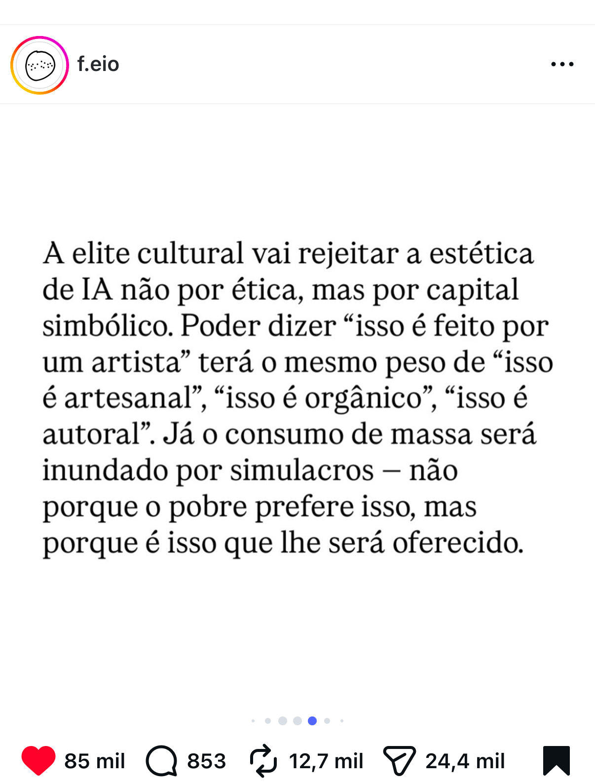 “Mãos erradas, olhos vazios, aquela simetria morta que não engana ninguém com repertório visual mínimo. E foi ali, numa almofada barata, que uma ficha grande caiu. A inteligência artificial não vai “democratizar” a arte. Vai segmentá-la socialmente.”