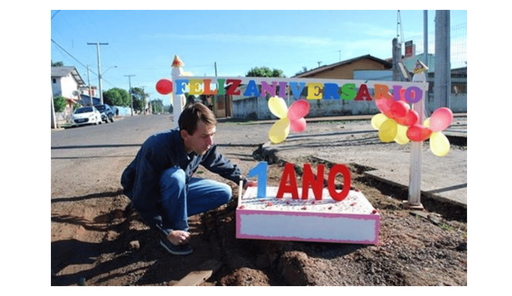 Brasileiro comemorando aniversário de 1 ano do buraco da sua rua