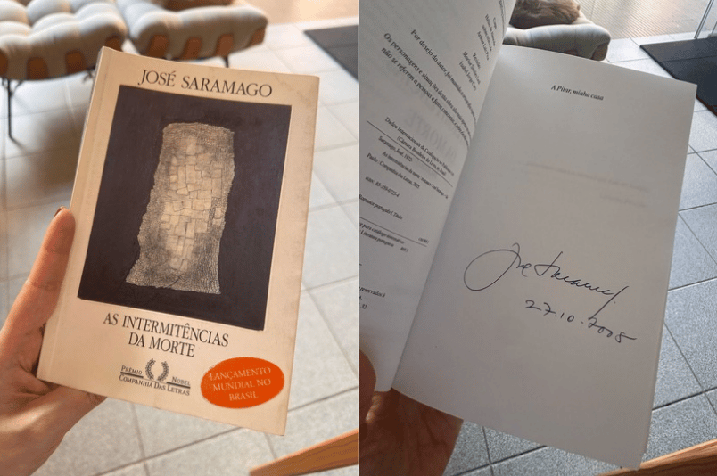 Foto do meu acervo pessoal. Depois de me encantar com “Ensaio sobre a Cegueira", tive a sorte de participar de uma leitura de “As intermitências das morte” em 2008, que contou com a presença do autor. Eu e minha amiga pegamos uma fila quilométrica só para garantir este autógrafo, que considero uma relíquia. Saramago faleceu em 2010 e, se não me falha a memória (não consegui confirmar no Google), essa visita de 2008 foi a última dele ao Brasil.