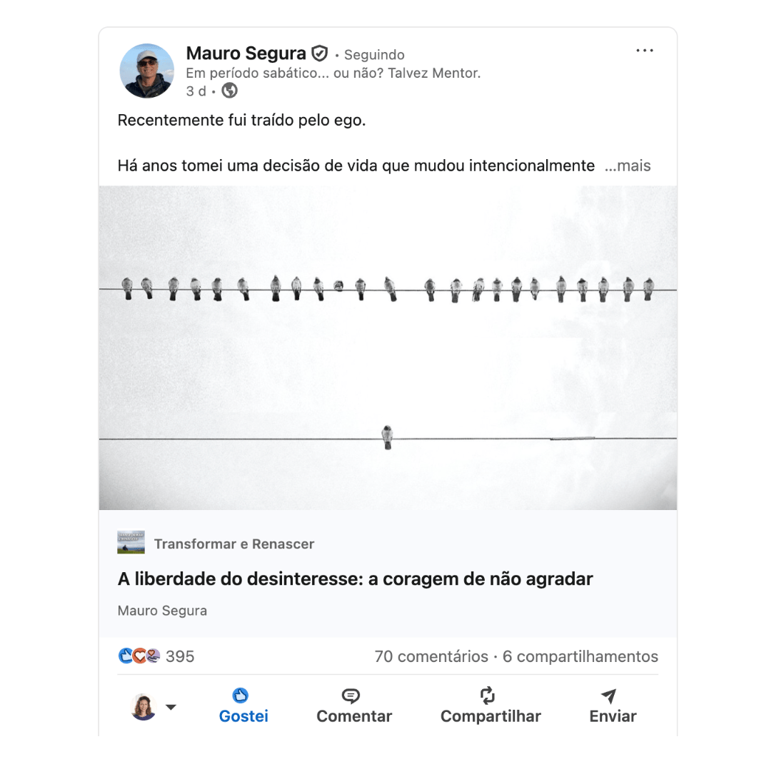Porque a escrita sensível e vulnerável que o Mauro produz é rara nas redes sociais corporativas. Ela pede tempo, digestão, reflexão, essa coisa toda que a gente adora dizer que é importante, mas dedica cada vez menos tempo para praticá-la.